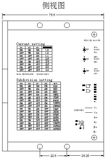 注:可根據客戶要求定制細分數! !注意 1、輸入電壓不能超過DC50V; 2、輸入控制信號電平為+5V-+28V范圍,高于+5V時無需外接限流電阻; 3、輸入脈沖信號下降沿有效; 4、驅動器溫度超過80度時驅動器停止工作,故障指示燈ALM亮,直到驅動器溫度降到50度時,驅動器需要重新上電才能恢復工作。出現過熱保護請加裝散熱器; 5、過流(負載短路)故障指示燈ALM亮,請檢查電機接線及其他短路故障,排除后需要重新上電恢復; 6、無電機故障指示燈ALM亮,請檢查電機接線,排除后需要重新上電恢復。 驅動器接線、尺寸示意圖