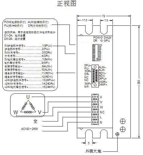 注:可根據客戶要求定制細分數! !注意 1、輸入電壓低于AC170V高于AC260V時,驅動器會自動保護; 2、輸入控制信號電平為5V,當高于5V時需要接限流電阻,此款驅動器自帶24V的信號接口; 3、輸入脈沖信號下降沿有效; 4、驅動器的散熱風扇在當驅動器的溫度超過48゜時才開始工作; 5、驅動器溫度超過80゜度時驅動器停止工作,故障指示燈ALM亮,直到驅動器溫度降到50度時,驅動器需要重新上電才能恢復工作。出現過熱保護請加裝散熱器; 6、過流(負載短路)故障指示燈ALM亮,請檢查電機接線及其他短路故障,排除后需要重新上電恢復; 7、無電機故障指示燈ALM亮,請檢查電機接線,排除后需要重新上電恢復。 !故障現象對應(電源燈POW燈除外) 1、模塊過流:單紅燈(ALM燈)常亮 2、驅動過熱:紅燈(ALM燈)與兩綠燈(PU燈和DR燈)交替亮 3、無電機: 紅燈(ALM燈)與DR燈交替亮 4、欠壓: 紅燈(ALM燈)與DR燈同亮 5、過壓: 紅燈(ALM燈)快閃 驅動器接線、尺寸示意圖